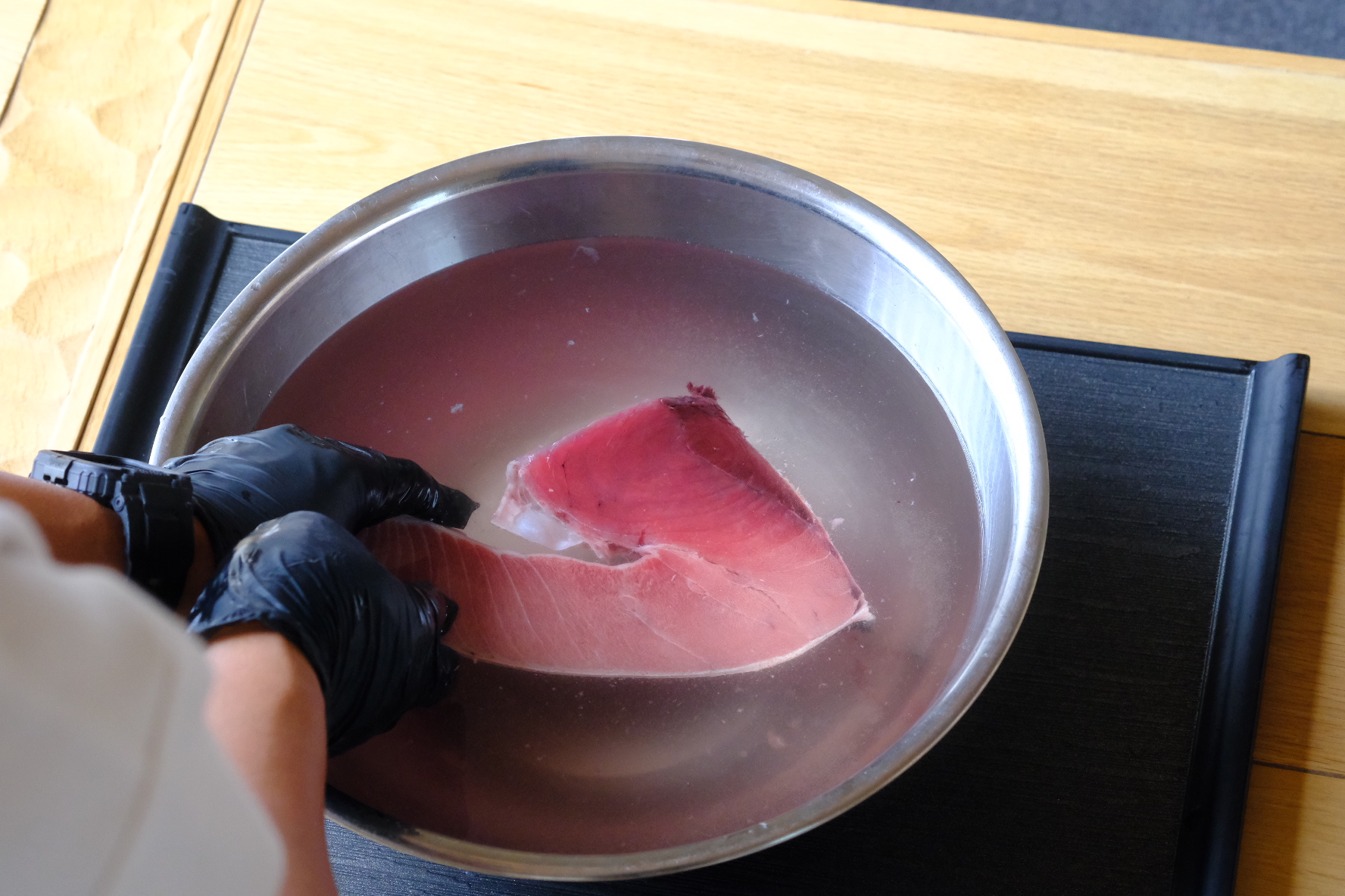 ③マグロのブロックを「7分~10分」ほど塩水に浸けておく