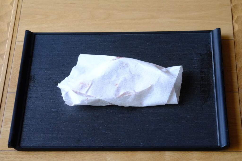 この時、粗悪なキッチンペーパーで拭くとまぐろにくっついてしまう可能性があるので気をつけてください。